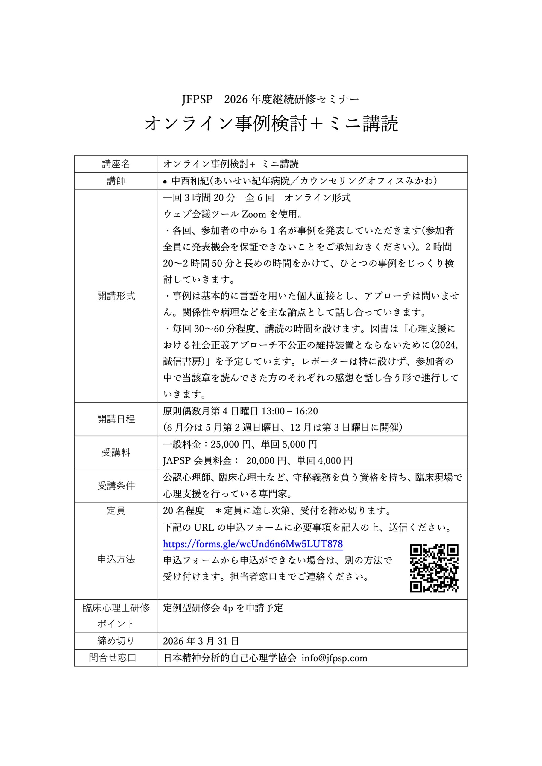 JFPSPは専門家のみなさまに参加いただけるセミナーを行っています。自己心理学をはじめとしたさまざまな精神分析的心理療法に関心をお持ちの専門家のみなさまのご参加をお待ちしています。